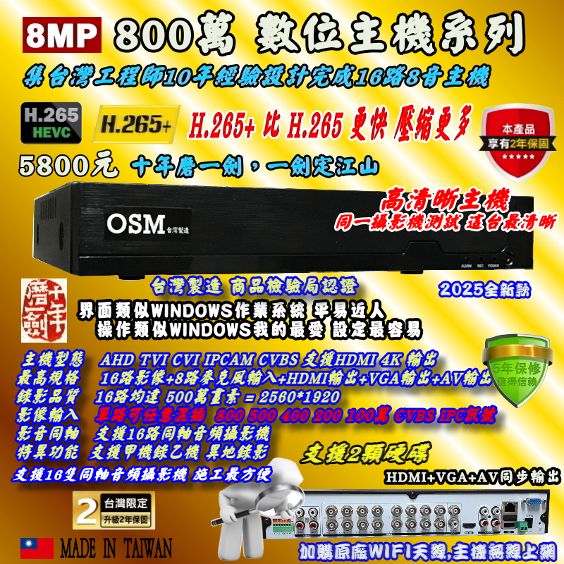 十年磨一劍 老客戶專用款 H.265+新款 800萬畫素 16路8音主機 二年保固 型號:5826-2